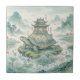 Traditional East Asian inspired artwork ceramic tile featuring a majestic turtle carrying an ornate pagoda across a serene lotus pond with butterflies and misty mountains. Ideal for fantasy art lovers, turtle enthusiasts, Asian art collectors, and anyone who loves peaceful zen-inspired landscapes.