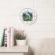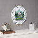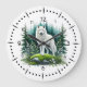 This image features a majestic white wolf standing on a moss-covered rock, surrounded by lush green foliage and delicate white flowers. The background showcases a dense forest of tall evergreen trees, creating a serene and natural setting. The wolf's piercing gaze and the detailed, vibrant greenery make this image both captivating and tranquil, perfect for nature-themed clocks.