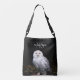Animal portrait photograph of majestic snowy owl standing on a branch with a personalizable custom name monogram above.