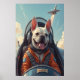 Meet Major Woof, the fearless Frenchie pilot decked out in a full Air Force flight suit with a bone patch on his shoulder and "WOOF-ONE" stitched proudly on his chest. Seated in a jet cockpit, his helmet visor reflects the sky while his tongue hangs out in pure joy. Behind him, a fighter jet launches with playful smoke trails. This fun, high-energy poster is perfect for aviation lovers, dog fans, or kid-friendly military décor.