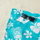Turquoise and White Colorway. A conversation print of tikis, palm trees, tropical fish, ukeleles, hibiscus and plumeria flowers are reminiscent of the designs used in vintage aloha shirts in the forties & fifties. The batik texture adds a unique texture throughout the design.This design comes in several colorways.