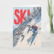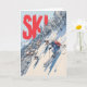 This dynamic skiing illustration captures the thrill of racing down a steep, snowy mountain toward a cozy alpine village below. Three skiers carve through fresh powder, surrounded by snow-covered trees and crisp blue sky. Bold red “SKI!” lettering adds energy and excitement, making it perfect for winter-sports lovers and adventure-themed gifts.