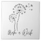Dandelion heads flower fluff line art on a decorative ceramic tile, with the words Make a Wish. Dandelions are sure signs of summer and almost everyone has blown dandelion fluff into the wind to make a wish. Use this sentimental flower art tile to remind you of childhood memories of the lazy days of summer. Great for a kitchen, bathroom, baby nursery, or patio area!