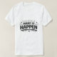 Monochrome typographic design featuring the phrase “Make It Happen” arranged in a bold, centered layout. The composition includes large lettering, radiating line accents, star icons, and curved underline elements. The high-contrast black and white style with subtle texture creates a clean, balanced, text-focused design suitable for apparel and accessories.