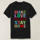 A colourful text Make Love Not War Stay Home against the black or dark colour background. Funny unique t-shirt for anyone. Do not forget to choose another style, size, colour, and gender of the apparel. You can transfer this design to another product. Have fun, buy one, enjoy, stay safe, and be happy! Show off your unmatched style when you go outside. Keep your chin up, stay safe, buy one, and be happy.