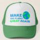 Image of blue and green planet Earth and the text Make The Planet Great Again of the same colours. Funny trucker hat for anyone. Customisable. You can change the image and all the texts. Do not forget to choose another colour of the hat.