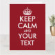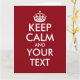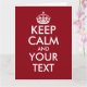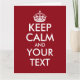 Make your own big oversized keep calm greeting cards. Funny Keep Calm and your text greeting card for men, women and kids. Cute vintage typography template slogan with crown. Personalizable quote and custom background colour. ie bright red. Create your own fun keep calm and carry on parody. Very large cards for him and her, mum, dad, husband, wife, uncle, aunt, son, daughter, father, mother, grandpa, grandma, brother, sister, friends, family etc. Trendy keepcalm meme. Extra large XL size. Bigger then normal. It's Huge! Fun for Birthday, Christmas Holiday, Thank yous etc.