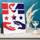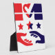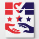 This design features a circular design with striped and colourful shapes, a handshake prominently displayed at the bottom, a ballot shape in the middle with a check mark icon created as negative space, and five arranged stars at the centre.
