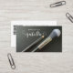 A modern minimalist makeup artist business card, featuring a script typography, and makeup artists tools of the profession on a charcoal grey background. QR code and social media on the back of the card. A simple chic style.