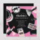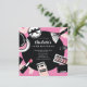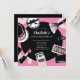 Colourful makeup makeover birthday party invitation set on a bright pink background with a coordinating black background for an extra special touch.