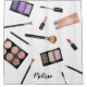 Cute makeup theme shower curtain featuring Destei's illustration of different kind of makeup items. There are makeup palettes and brushes, pink and red lipstick, mascara and foundation. There is also a personalizable text area for a name.