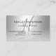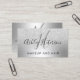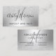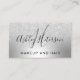 An elegant modern monogram , stylish makeup artist business card with elegant modern simple hand lettering style typography in white on a faux silver glitter and metallic silver metallic foil trendy and elegant background. all text is customisable, add your social media.