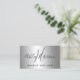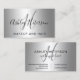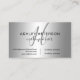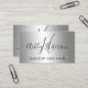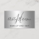 An elegant modern monogram , stylish makeup artist business card with elegant modern simple hand lettering style typography in white on a faux metallic silver metallic foil trendy and elegant background. all text is customisable, add your social media.