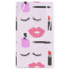 A cute makeup design, featuring red lipstick, lips, a purple eyeliner pencil, false eyelashes, and pink nail polish.