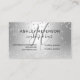 An elegant modern monogram , stylish makeup artist business card with elegant modern simple  hand lettering style typography in white on a faux silver glitter confetti and metallic silver foil trendy and elegant background. all text is customisable, add your social media.
