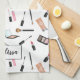 This kitchen towel features Destei's illustrated pattern of various kind of makeup products. These makeup products include palettes, powder with mirror, makeup brushes, lipstick, lip gloss, foundation and mascara. There is also a personalizable text area for a name.