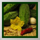 It's summer and the cucumbers are hanging from their vines. Time to make dill pickles! This fine art photography poster displays all the important ingredients: cucumbers, garlic, hot chili peppers, dill and pickling spices. One yellow cucumber flower has been added for decoration.