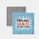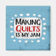 "Making Quilts Is My Jam" is a cute text design in blue with black and red text, along with a white accent shape and white textured whimsical dots surrounding it.