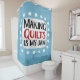 "Making Quilts Is My Jam" is a cute text design in blue with black and red text, along with a white accent shape and white textured whimsical dots surrounding it.
