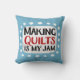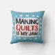 "Making Quilts Is My Jam" is a cute text design in blue with black and red text, along with a white accent shape and white textured whimsical dots surrounding it.