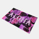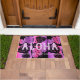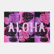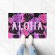 Black with pink and violet colorway. The message of Aloha welcomes your visitors to your own tropical paradise. Giant graphical tropical monstera leaves interplay with a beautiful striped blend of colours that are reminiscent of the Hawaiian landscape. There are other home decorating items in the same design. The pattern comes in several colorways. You can customise the message.