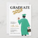 Graduation Party Invitation male portrait drawing graduate in green cap and gown, black hair and gold 2023 balloons. Personalise all of your grad's party details for a unique graduation invitation.
