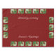 A pair of male and female northern red cardinals perch on holly tree branches covered with ripe berries. All on a festive holiday red background. Image created from an original oil painting by Crista Forest.