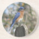 Coaster design features a photograph of a bright blue male Eastern bluebird.
