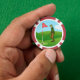 Awright, so there isn’t a saint in sight here. We just couldn’t help ourselves from issuing these humourous, stylised images of male golfers on their own on poker chip golf ball markers! Front: An optimistic, elderly male golfer makes a tap-in putt on the 18th hole. This dapper gentleman wears a yellow cap and tie, white shirt and green sport jacket, and tan knickers with yellow socks. Back: A young, panic-stricken duffer tries to blast his way out of a bunker or sand trap with a pitch shot onto the green. The height of Victorian male fashion, he is outfitted in a white shirt and brown plaid sports suit accessorised with a burgundy cap and matching socks. + Public Domain line drawings or clipart colourized by Saints_Aplenty.