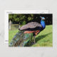 Closeup of male Indian Peafowl (Pavo cristatus) on grass seen from behind