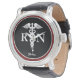 Male Nurse RN Caduceus Modern Black Burgundy Watch makes a great gift idea. The black leather band is also available in different colours and styles. The watch facing is designed with a black and dark maroon two tone colour customisable background and a white medical caduceus symbol on the centre. "RN" is on the sides of the symbol. Personalised with name in white calligraphy script lettering on the lower area.