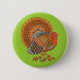 This pin back button has a male turkey with fanned tail has feathers that are in browns, oranges, and blues and looks very dignified standing in a scattering of leaves. The background is green.