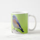 A mug with two images of a male Western Bluebird. The images are duplicated so that there are two bluebirds on the cup - it's the same bird. There is a slight tone difference between the two bluebird images due to the difference in the background.