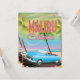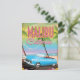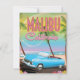 Malibu California vintage travel poster of a classic old car by a beautiful beach.