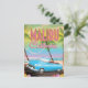 Malibu California vintage travel poster of a classic old car by a beautiful beach.