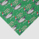 Here's a fun gift wrap for any duck lover. It features an illustration of male mallard ducks walking and wearing Santa hats while pastel snowflakes fall around them. The text "Quacking through the snow..." appears above each duck's back in a white font outlined in red.