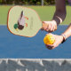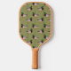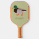 Create a personalised gift that's perfect for pickle ball players who are also bird lovers when you add their name to this pickleball paddle. It features a realistic style illustration of a male mallard duck in green and brown against a pale green background with a name or other text in coordinating olive green lettering. The reverse side has a matching pattern of ducks and stripes.