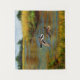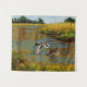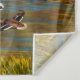 Male and female mallard ducks in flight over a golden pond, water rippling to reflect the colours of the background autumn foliage glowing in the sunlight. Realistic artwork created from an original oil painting by wildlife artist Crista S. Forest.