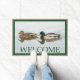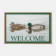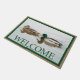 Two Mallard ducks, a drake and a female, swim together in an Alaskan pond. Text reading, "WELCOME" also appears.