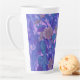 Coffee latte mug featuring "Mallow Bloom" painting, blooming summer flowers in twilight colour palette - purple, violet, mauve, teal. Acrylic on paper, digital manipulations, 2020