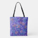 Tote bag featuring version of "Mallow Bloom" painting, blooming summer flowers in twilight colour palette - purple, violet, mauve, teal. Acrylic on paper, digital manipulations, 2020