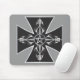 Black Maltese cross features a silver pentagram centre that is surrounded by 4 swords with flames.