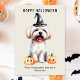 This greeting card features a cute Maltese dog wearing a witch hat with little pumpkins. This watercolor design is modern and ready to be personalised. On the back, it says “Pup-kin spice and everything nice,” but this can be changed if desired. It’s the perfect card to send to friends and family during the Halloween season!