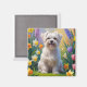 A cheerful dog sits peacefully on lush green grass, surrounded by colourful spring blooms under a soft blue sky. This digital oil painting captures a serene moment with expressive brushstrokes, warm colours, and a sense of gentle joy.