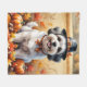 A watercolor-style painting of a cheerful dog sitting amidst a pile of vibrant fall leaves, surrounded by tiny pumpkins and scattered acorns. The dog wears a little pilgrim hat and beams with joy, capturing the spirit of Thanksgiving. In the background, soft harvest fields and golden-hued trees create a peaceful countryside ambiance. Gentle textures and warm, muted autumn tones give the scene a cosy, nostalgic feel perfect for celebrating the beauty of the season.