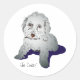 This graphic illustration depicts a cute and fluffy Maltipoo or Maltese and poodle mixed breed puppy in a seated pose.