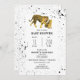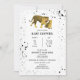 A baby shower invitation featuring an illustration of a baby and mama tiger surrounded by black paint splatter over white background.