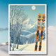 Hello from the snowy mountains of Mammoth Mountain, California! We hope you're having a wonderful ski vacation. This postcard features a gorgeous blue-grey mountain landscape with retro ski boards in an orange tribal pattern.