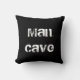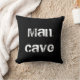 One side of the pillow is black and white and reads "Man Cave" in a manly font. The other side features a black and white "film" pattern and reads "Now Appearing, Your Name". This pillow is the perfect gift for the man in your life who enjoys watching movies in his man cave.