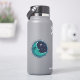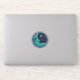 Blue crescent moon with the face of a sleeping man in a starry night sky. Part of his face is lit up by a bight white shining star. The design is set inside a blue circle border with small white and blue dots.
